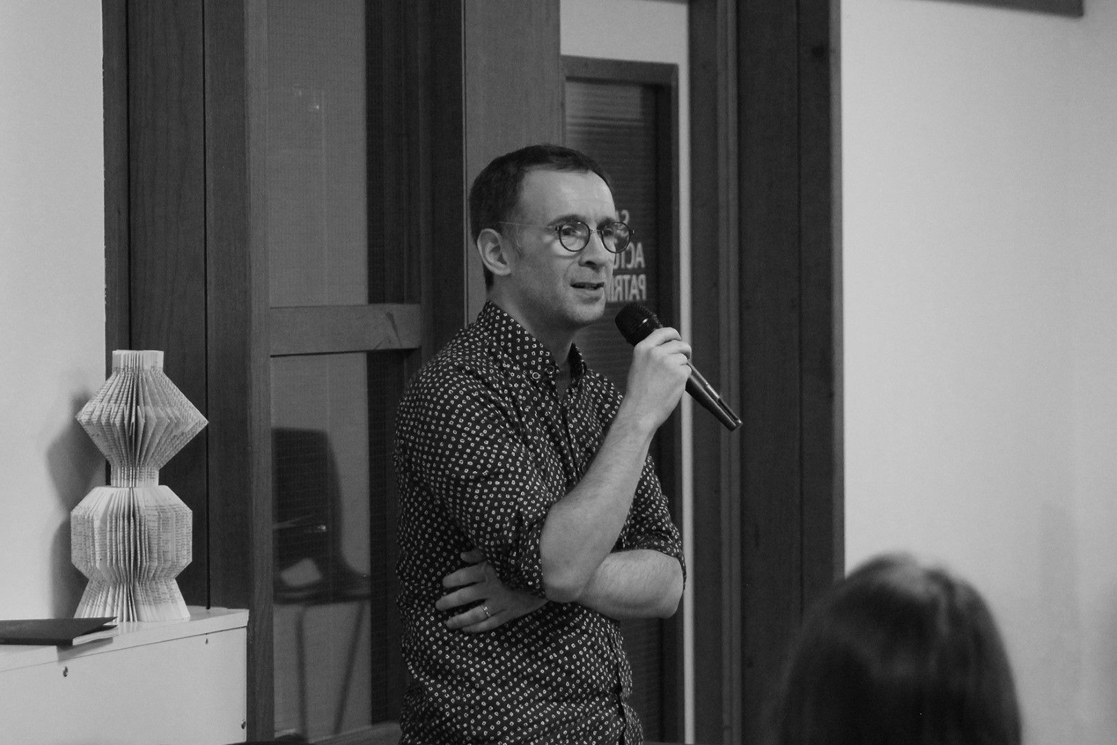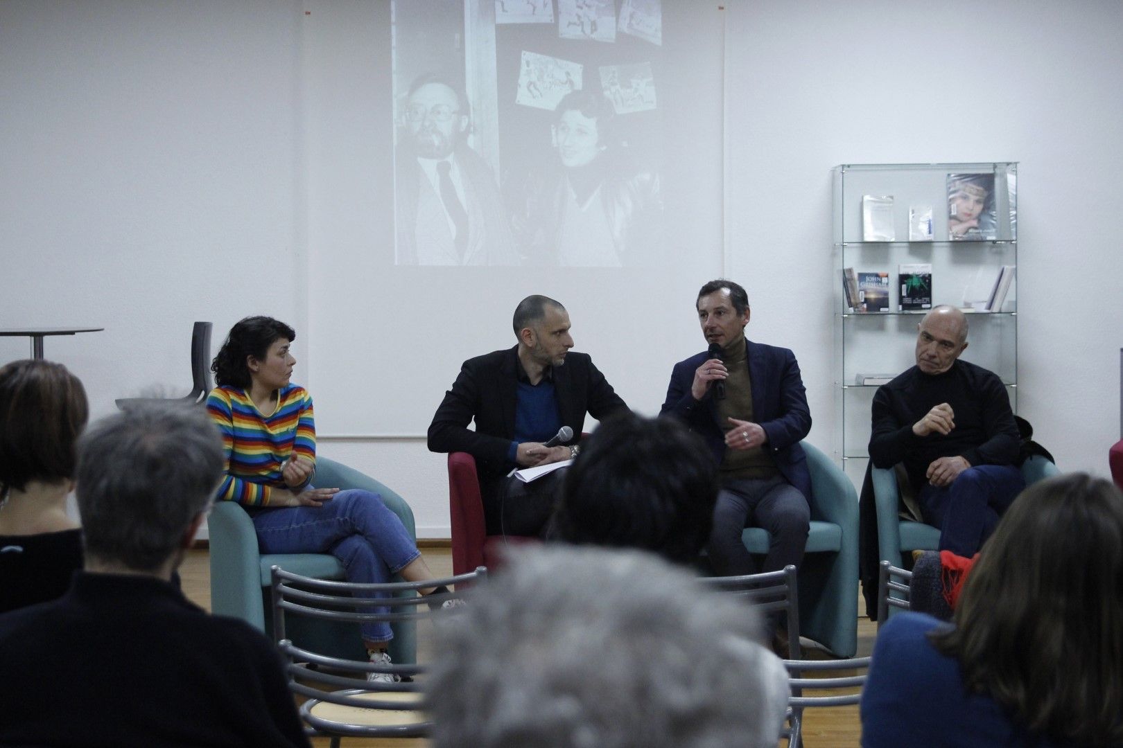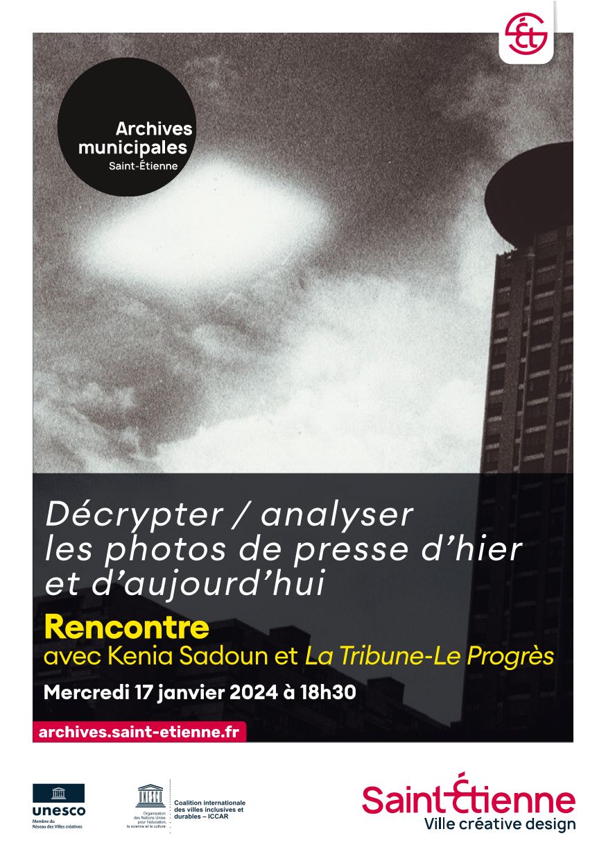 Avec Kenia Sadoun, photographe en résidence ; Pierre Régis Dupuy, directeur des archives municipales et métropolitaines ; Frédérick Macé, directeur départemental Loire-Haute-Loire de La Tribune-Le Progrès ; Richard Mouillaud, chef du service photo ; Rémy Perrin, photo-reporter ; Celik Erkul, photo-journaliste à la retraite ; Josselin Giret, journaliste spécialisé dans l'éducation aux médias et à l'information.