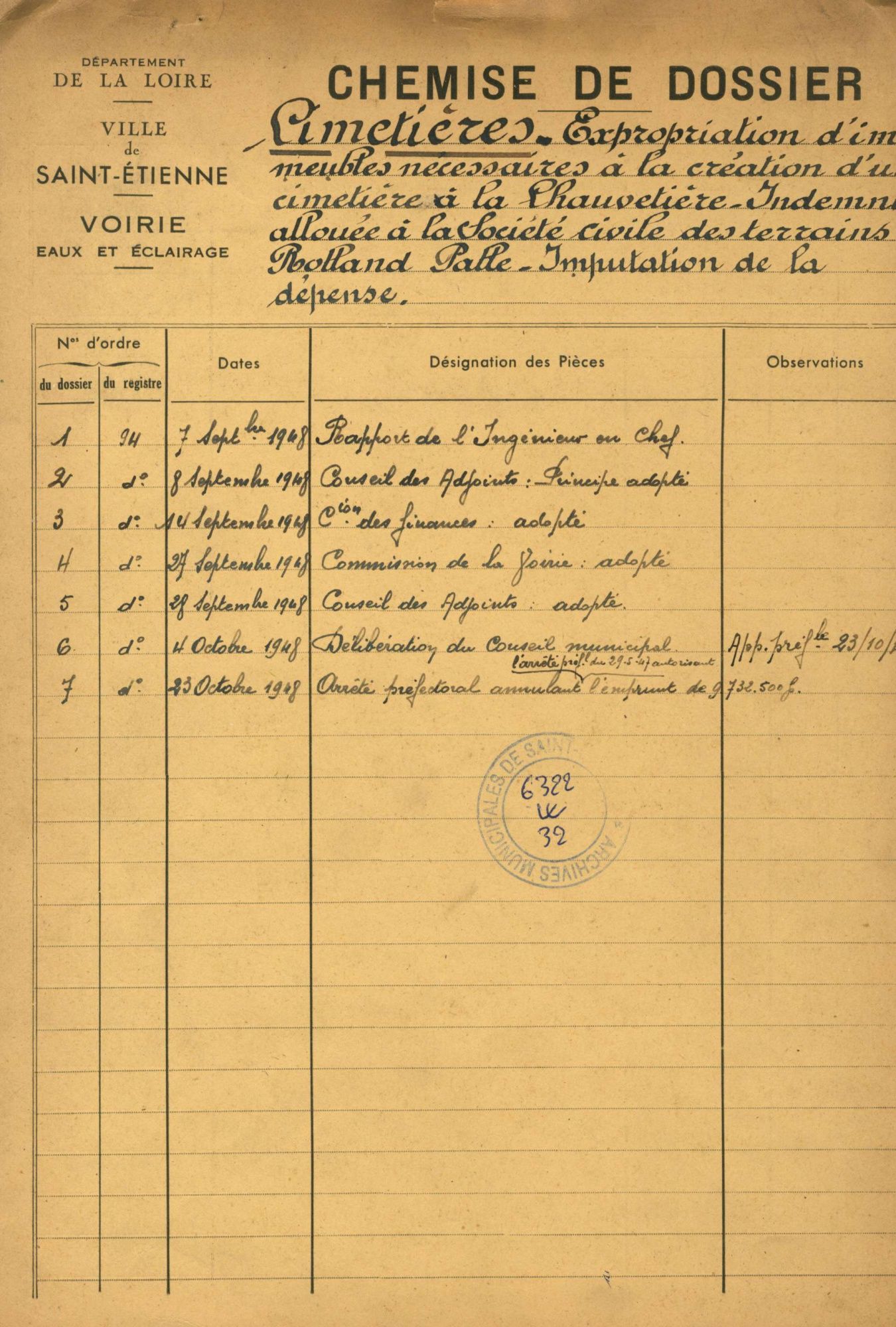 Cimetière de la Chauvetière A consulter aux Archives municipales Documents d'archives : 4 M 1 Cimetières. Chauvetière, création, acquisition, 1943-1954. 6322 W 32 Opérations d'urbanisme. Bâtiments et espaces publics, 1933-1972.