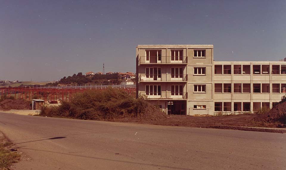 32 S 31 ICONO 5, 8 Projet centre technique municipal, vue éloignée du bâtiment en chantier à partir d'une route, 1972.