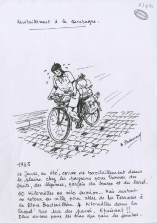 Même installées dans le train nous n'étions pas tranquilles : les Allemands pouvaient effectuer des contrôles, exercer des représailles. Mais, ce que nous redoutions le plus se passait en gare de la Terrasse. Les gendarmes - bien français ceux là - faisaient ouvrir les bagages. Les produits rationnés étaient saisis. Que devenaient-ils? A vous d'imaginer. Nous eûmes de la chance de toujours échapper à ces vols organisés.