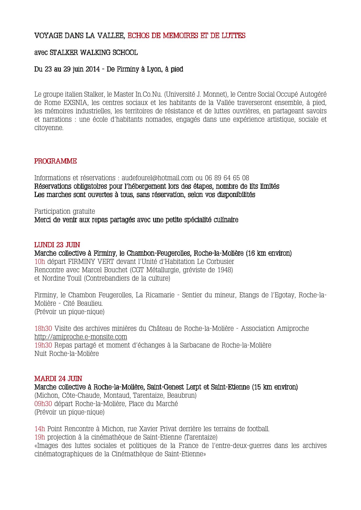 À travers les vallées de l'Ondaine, du Gier et du Rhône, le long de la rue sans joie, de la vallée rouge ou du couloir de la chimie, leurs pas les mènent auprès d'habitants, porteurs de mémoires et transmetteurs de savoirs. Des anciens de Creusot-Loire à Firminy, des joueurs de sarbacane à Roche-la-Molière, des gens du voyage à Saint-Étienne, Stefano Moscato - auteur du livre Le cantonnement - à Lorette, le père Delorme - un des initiateurs de la Marche pour l'égalité et contre le racisme en 1983 - à Oullins... reviennent sur leurs parcours, relatent les luttes qui se sont déroulées ici et là. Certains décident de suivre les marcheurs jusqu'à la prochaine étape ou un peu plus loin. À chaque rencontre, les participants consignent les récits : photographies, enregistrements, notes, autant de traces qui sont aujourd'hui conservés par les marcheurs, simples souvenirs de moments vécus pour les uns, matériaux pour des travaux de recherche en cours ou à venir pour d'autres.