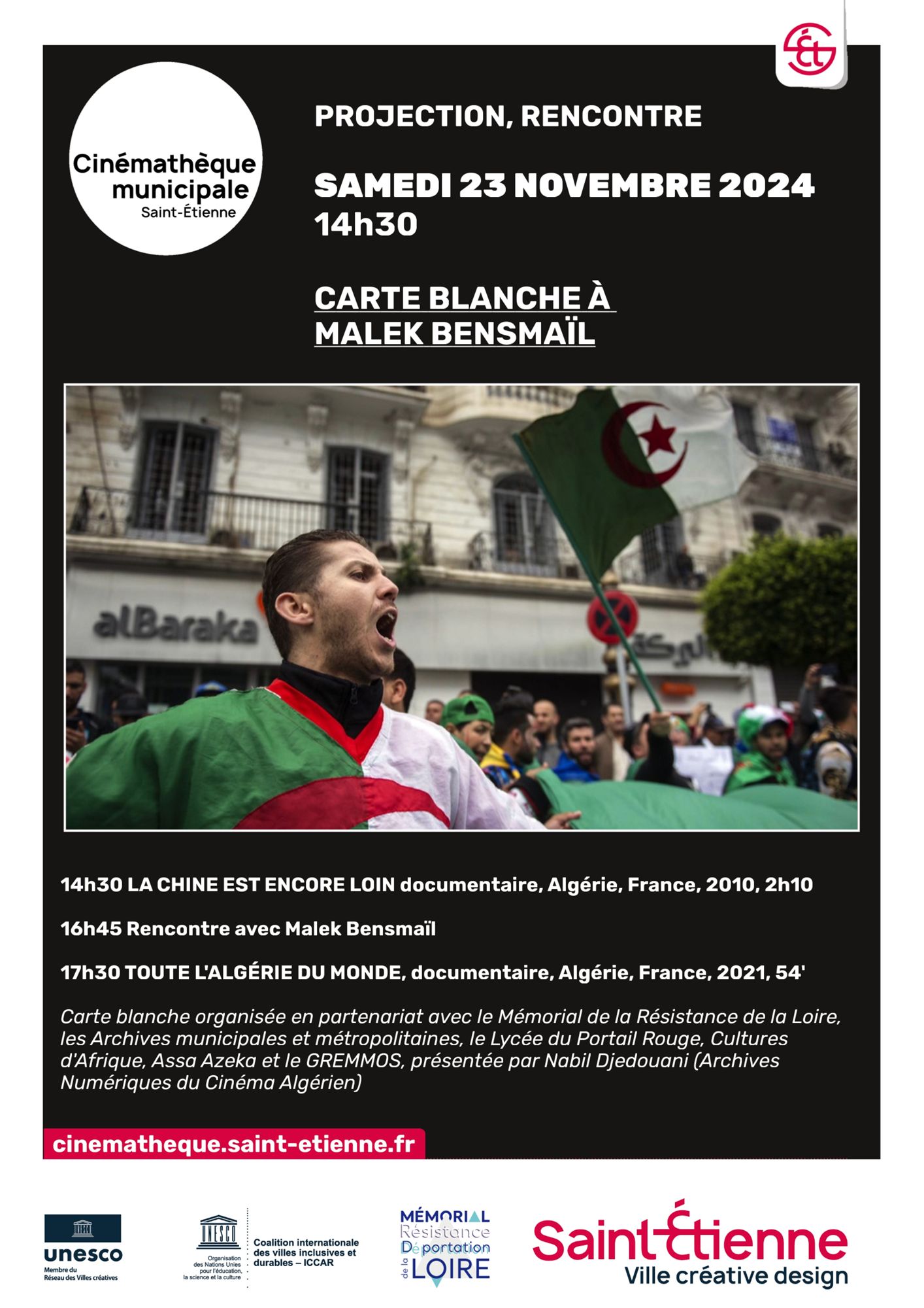 Cette Carte blanche présentera la plupart de ses films à la Cinémathèque durant trois jours, organisée en partenariat avec le Mémorial de la Résistance et de la Déportation de la Loire, les Archives municipales et métropolitaines, le Lycée du Portail Rouge, Cultures d'Afrique, Assa Azeka, le Gremmos et les Archives numériques du cinéma algérien.