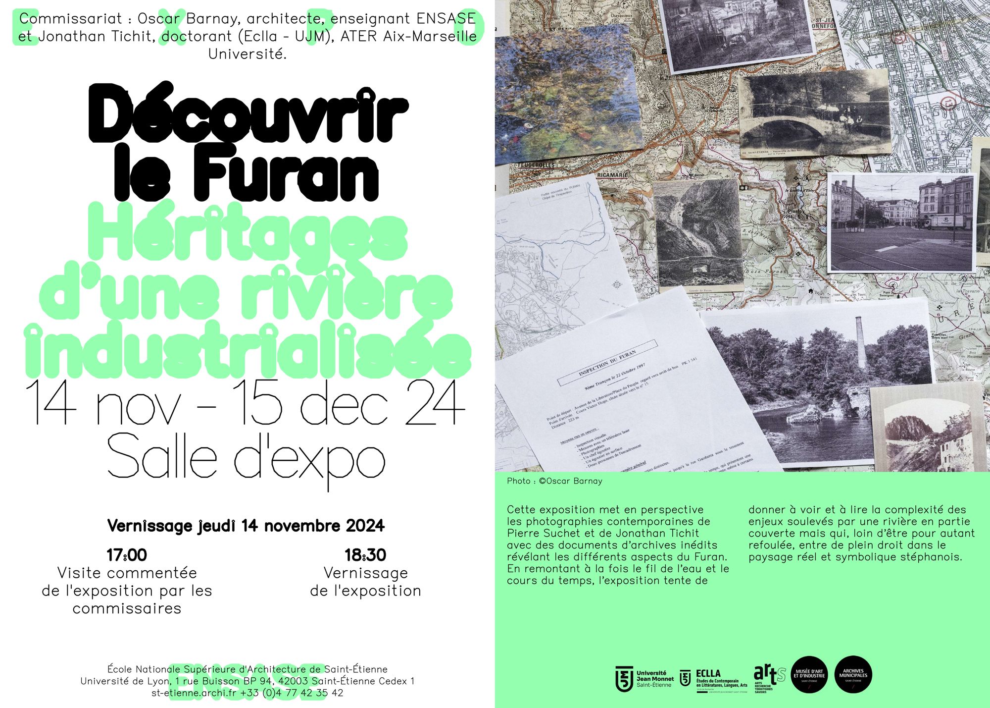 Cette exposition met en perspective les photographies contemporaines de Pierre Suchet et de Jonathan Tichit avec des documents d’archives inédits révélant les différents aspects du Furan. En remontant à la fois le fil de l’eau et le cours du temps, l’exposition tente de donner à voir et à lire la complexité des enjeux soulevés par une rivière en partie couverte mais qui, loin d’être pour autant refoulée, entre de plein droit dans le paysage réel et symbolique stéphanois.